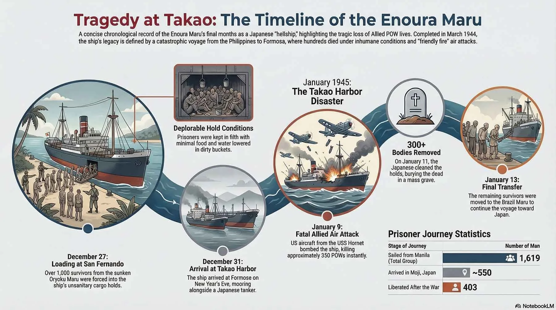 The history of the Japanese "hell ships" during the Second World War is a dark chronicle of human suffering, forced labor, and tragic friendly fire. Among the 134 Japanese vessels that transported roughly 126,000 Allied prisoners of war (POWs) across the Pacific, Enoura Maru occupies a particularly harrowing place. Serving as a secondary prison transport for the severely weakened survivors of the infamous Oryoku Maru, Enoura Maru became the site of yet another massive loss of life when it was attacked by American aircraft in early 1945.