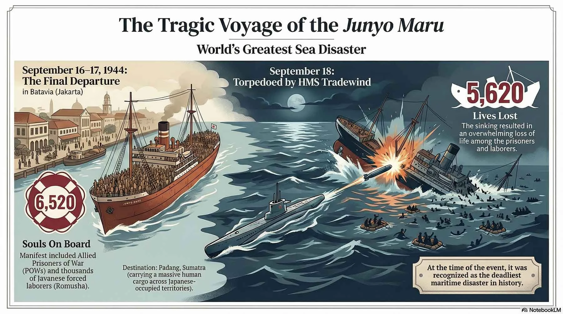 In 1944, Jun’yō Maru became one of the deadliest maritime disasters of the Second World War. A Japanese cargo ship used to transport Allied prisoners of war and thousands of Asian forced laborers, it sailed from Batavia, Java, in September 1944, bound for Sumatra. On 18 September 1944, off the west coast of Sumatra, the unmarked ship was torpedoed by the British submarine HMS Tradewind, whose crew had no way of knowing that POWs and romusha were aboard. Public historical accounts agree that the sinking killed more than 5,000 people, making Jun’yō Maru one of the largest Hellship tragedies of the war.