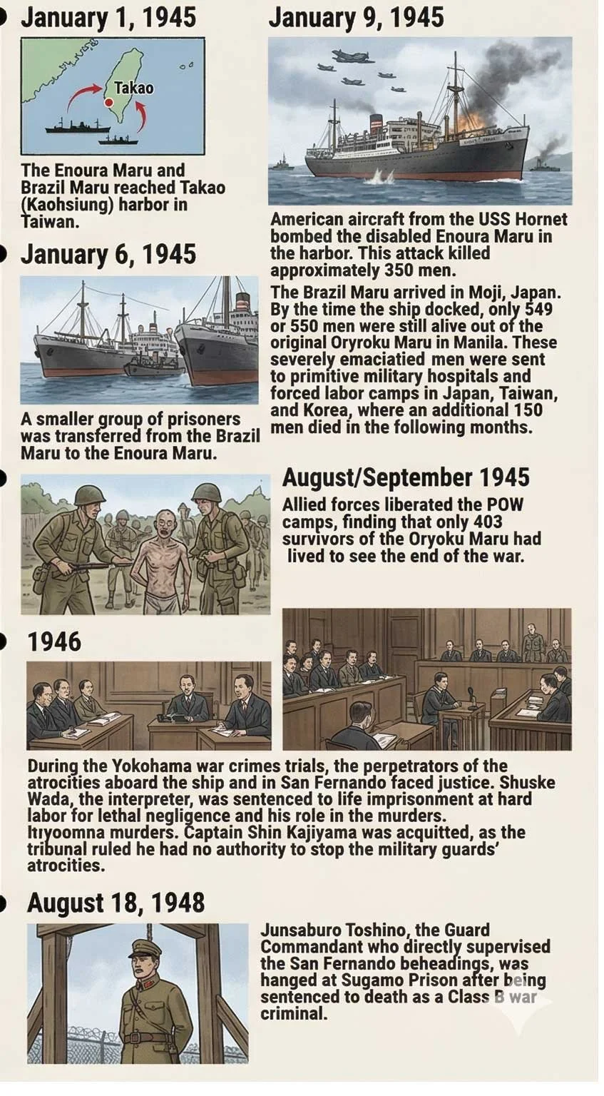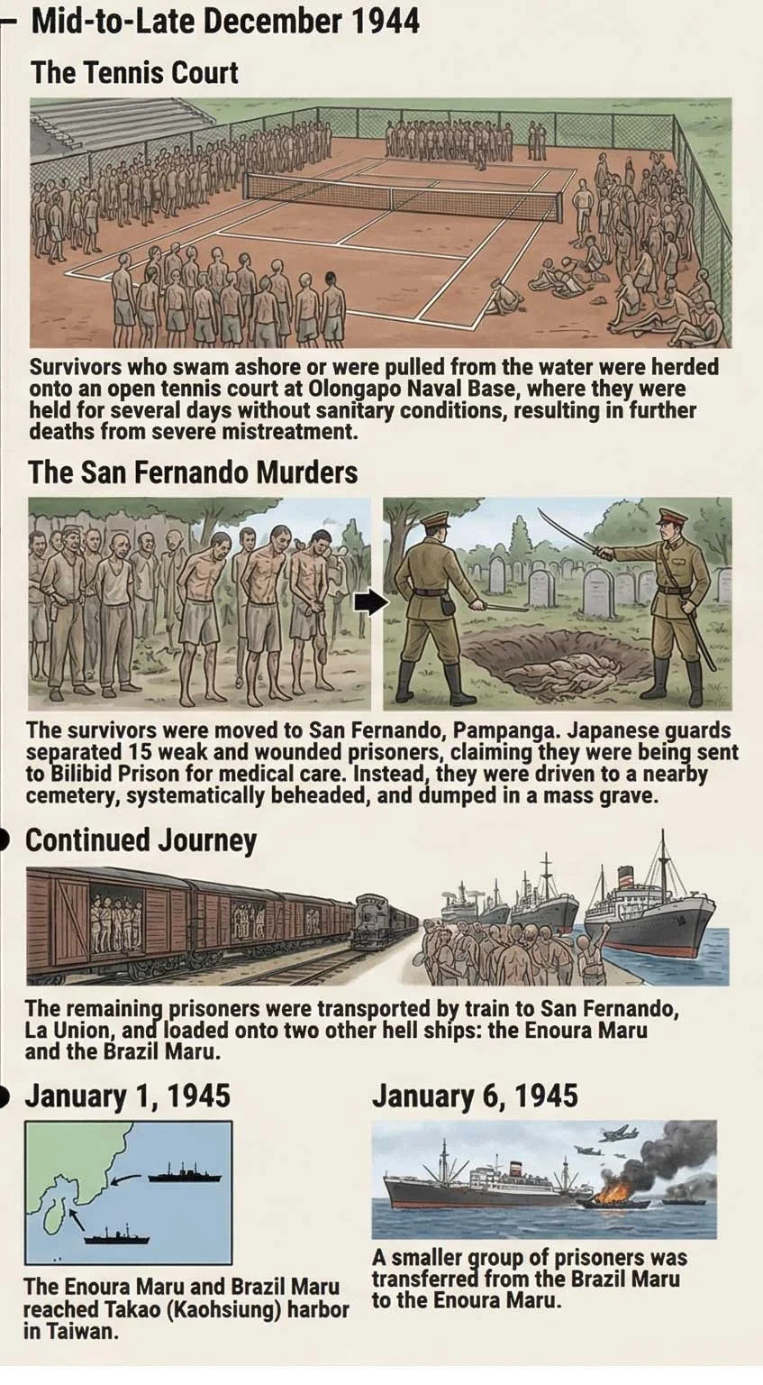 The prisoners who survived the massacre and the horrific conditions in San Fernando were still far from safety. The remaining POWs were loaded onto a train and transported to San Fernando, La Union. From there, they were forced aboard two more hell ships to continue their grim journey north: the Enoura Maru and the Brazil Maru. These ships reached Takao (Kaohsiung) harbor in Taiwan by New Year's Day, 1945.