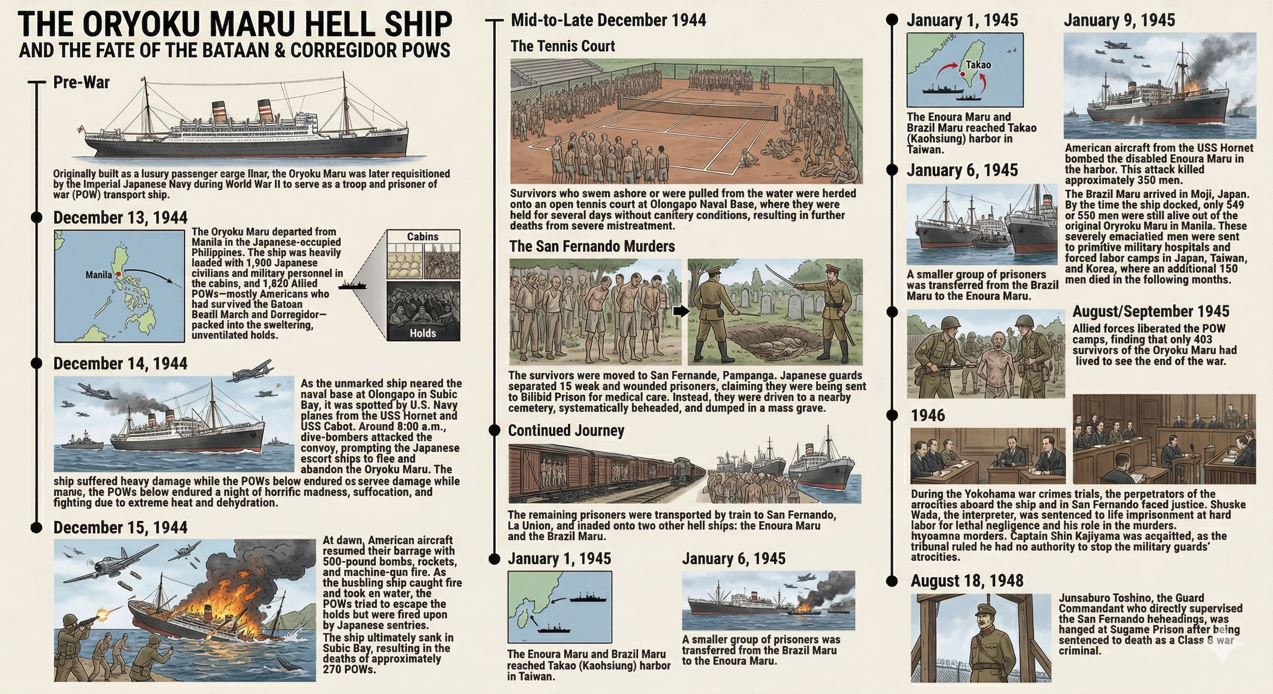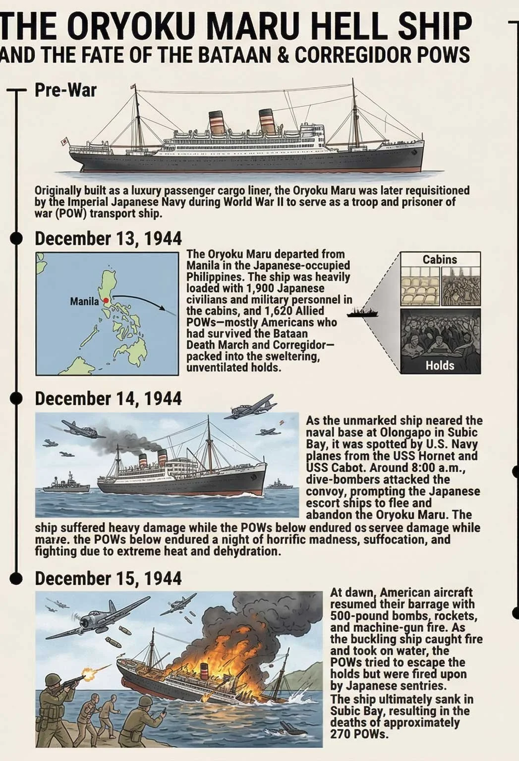 In December 1944, Oryoku Maru became one of the most tragic ships in the history of the Japanese Hellships. A Japanese passenger-cargo vessel pressed into wartime transport service, it left Manila on 13 December 1944 carrying more than 1,600 Allied prisoners of war, most of them Americans captured in the Philippines.