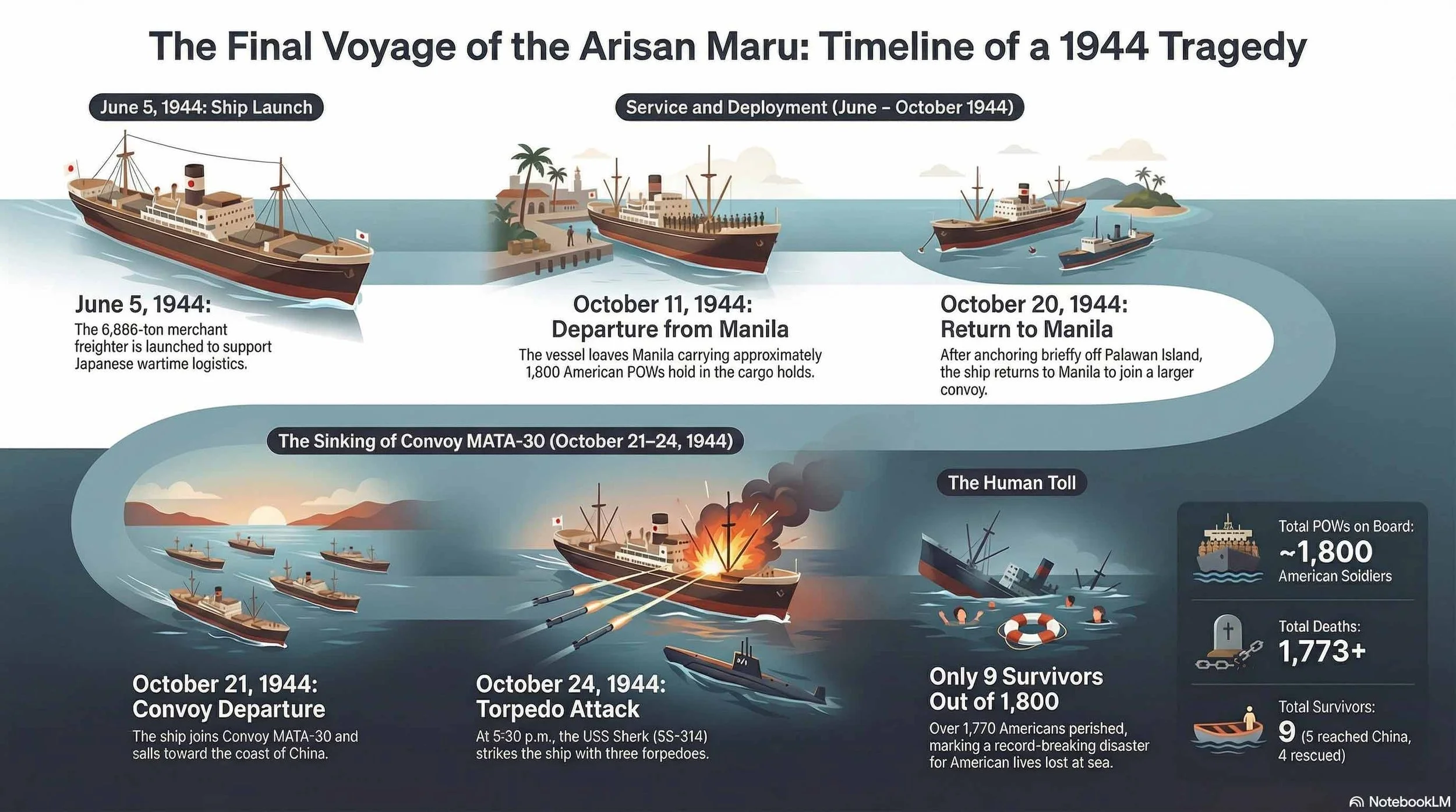 During the brutal conflict of the Pacific War, the Imperial Japanese military transported tens of thousands of Allied prisoners of war (POWs) across the ocean to serve as forced laborers in Japan, Manchuria, and other occupied territories. These unmarked transport vessels became infamous among the prisoners as "hell ships" due to their nightmarish, suffocating, and inhumane conditions. Tragically, because these ships were unmarked and actively supporting the Japanese war effort, they became prime targets for Allied submarines and aircraft. Over the course of the war, Allied forces inadvertently killed more than 19,000 of their own captive men in devastating friendly fire incidents. Among these tragic vessels, Arisan Maru stands out as the site of one of the most horrific maritime disasters of World War II. The torpedoing of Arisan Maru in October 1944 remains the largest single loss of American lives at sea in the history of the United States military